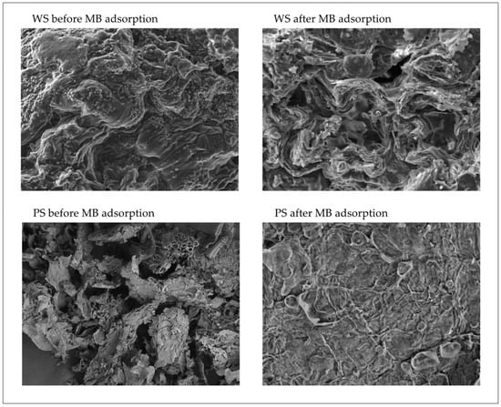 The results of the BET analysis show that PS and WS, in their natural states, have a relatively small surface area. The comparison of the pictures before and after the adsorption of MB dye in SEM analyses (Figure 2) corresponds to a smoothing of the porous structure of the samples and a more uniform morphology, which suggests the formation of a coating on the surface of the materials. An MB molecule covering the surface of PS and WS can also be observed as an accumulated spherical shape on the material, which is a prerequisite for successful dye adsorption. Similar observations are made by other authors [27,28].