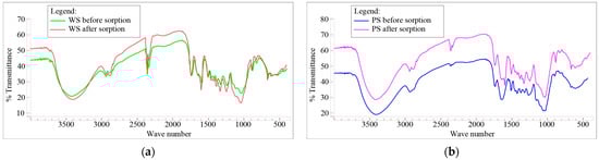 The FTIR spectra have typical characteristics of lignocellulosic materials (cellulose, hemicellulose, and lignin) and are close to the results published in the literature for peanut and walnut shells [18,29,30]. Similar results of the FTIR spectrum for both PS and WS prove the presence of hydroxyl, amino, ester, and carbonyl groups, which contribute to the negative charge of the surfaces. This is a favourable prerequisite for the binding of cationic MB dye molecules. It can be suggested that the adsorption takes place through the functional groups present on the surfaces of both materials. Similar conclusions are drawn by other authors [29,30].