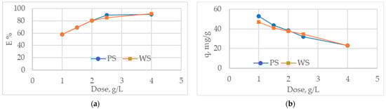 The effect of the dosage of PS and WS (1.0–4.0 g/L) on MB removal and the adsorption capacity of the materials is shown in Figure 4.