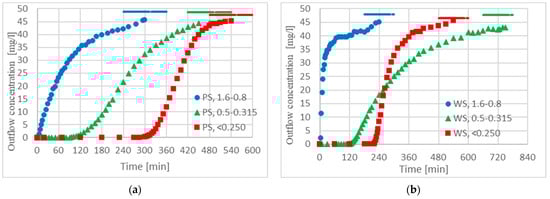 Fixed-bed outflow concentrations of (a) PS and (b) WS for different fractions.