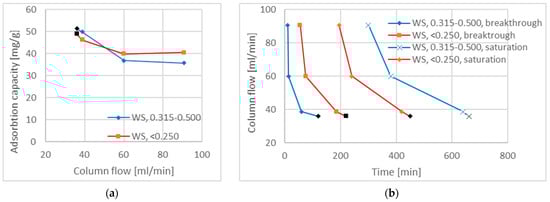 The obtained results of effluent concentrations vs. elapsed time are given in Figure 5. For both materials, there is an immediate breakthrough in the largest fraction of 1.6–0.8 mm. This is a probable reason for the lack of the typical S shape in the curve, observed usually in fixed-bed adsorption studies [26], which is also observed for the smaller fractions. However, for the medium fraction of WS, the shape of the curve differs compared to other WS fractions (Figure 5b). The elapsed time until the breakthrough in the fixed bed, the time for reaching 90% of the initial MB concentration, and the layer saturation time are summarised in Table 5.