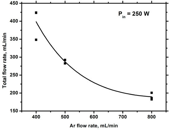 The first of these reasons is obvious and is related to the dilution of hydrocarbon vapor with argon in the plasma. This should lead to a decrease in the share of energy for gas and, consequently, a decrease in its temperature. Measuring the emission of the Swan bands at different Ar flow rates and modeling them with the SpecAir code [43] allowed us to obtain the rotational and, equal to it, gas temperature (~4000 K) under the experimental conditions [46]. It does not depend on the Ar flow rate. The reasons for this are analyzed in detail in [44]. Briefly, they summarize that the reduction in the share energy loss for heating due to dilution with argon can be compensated for by a decrease in the thermal conductivity of the medium and a decrease in the thermal effect of chemical reactions. Since at such temperatures the kinetics of chemical processes is controlled by thermal processes [47] and the temperature does not change, we can argue that the product yield will decrease due to the dilution of hydrocarbon vapor with argon. Figure 3 and Figure 4 show the change in the total gas flow rate and product concentration at the reactor outlet when the argon feed rate is changed.