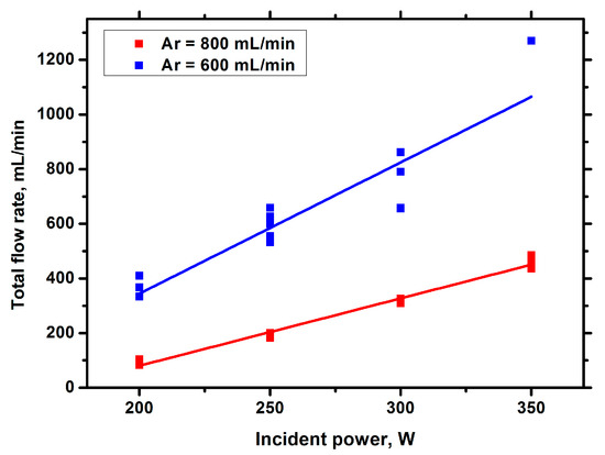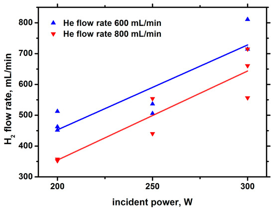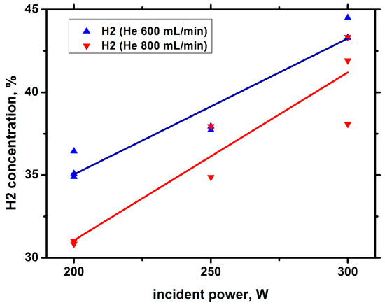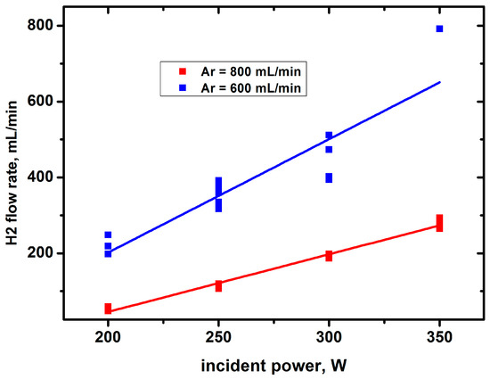 From the experimental results obtained, it can be concluded that, when adding argon, the dilution of hydrocarbon vapor with argon is the determining factor affecting the product yield, and an increase in the frequency of gas bubbles cannot compensate for this effect. Note that when the argon content decreases, the hydrogen yield increases, but the soot yield also increases, which is a disadvantage. Therefore, when developing technology, it is necessary to find a compromise between these processes. Product yields increase with increasing incident power (Figure 5, Figure 6 and Figure 7).