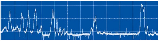 As has already been mentioned in previous works, the MD in liquids is a set of random discharge pulses [41]. An example of a signal from a photodiode illustrating this is shown in Figure 8. The dynamics of solitary discharge development are presented in Figure 9. Figure 9 shows the time variation of the discharge emission intensity obtained with the K-011 camera. The change in the size of a gas bubble with plasma is difficult to determine from conventional discharge photographs. Reliable information about it is provided by shadow photographs. An example of such photographs for a solitary discharge pulse (Figure 10) under argon barbotage is shown in Figure 11.