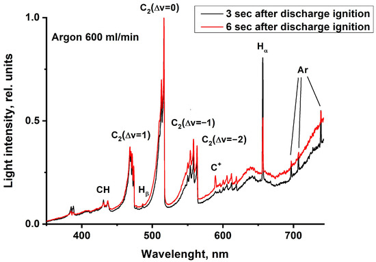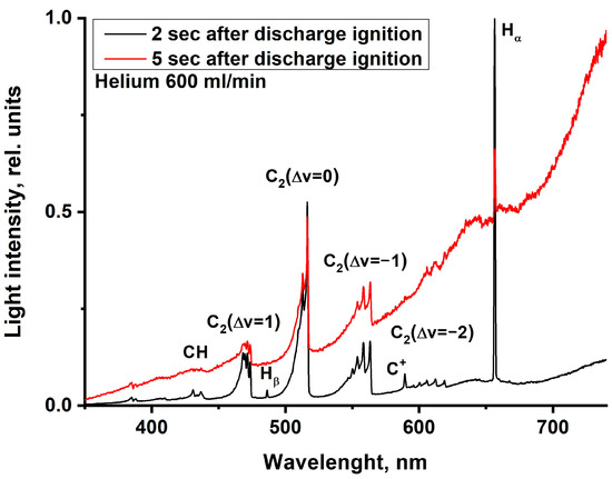 Firstly, in the spectrum shown in Figure 17, the broadband continuum plays a much larger role in the discharge emission than in Figure 13. This is indirectly confirmed by the results of the chromatographic analysis, which showed a higher rate of hydrogen formation and a higher rate of hydrocarbon decomposition in helium barbotage. This leads to an increase in the rate of formation of carbon-containing solids.