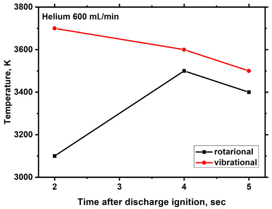 The processing of the emission spectra of C2 radicals using the SpecAir package [43] allows us to determine their rotational and vibrational temperatures. In [46], it was shown that under the experimental conditions with atmospheric pressure above the liquid surface, the rotational temperature may be considered as the gas temperature. The changes in rotational and vibrational temperatures during discharge burning are shown in Figure 14.