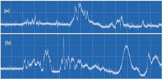 Oscillogram of integral discharge emission in the time scale of 5 ms/division: (a) without the addition of CO2 and (b) with the addition of CO2 (60 mL/min).