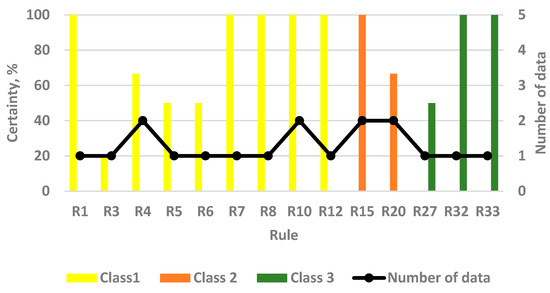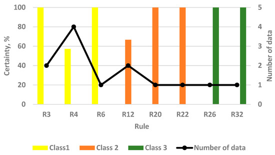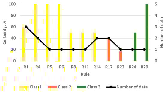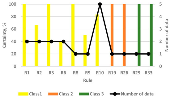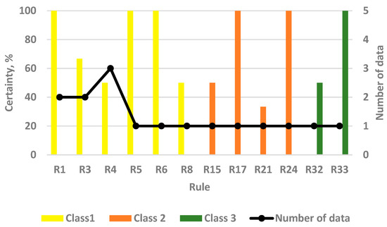 The certainty shown in Equation (7) measures the probability of the conditional attribute being classified into the decision attribute. A high certainty percentage of 100% indicates the generated rule is certain to the correct conditional attribute to be classified in the respective decision class, whereas the uncertain rule has the certainty factor to be less than 100% or a certainty factor of less than 1