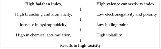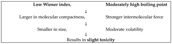 TIs have been utilized for predicting toxicity and properties of chemicals [11]. For instance, the valence connectivity index, the Balaban index, and the electropy index were used to predict the underlying relationship between the molecular structure of ethers and toxicity in mice [13]. In toxicology, molecular topological indices have been applied to study the toxicity of alcohols, pesticides, and ionic liquids. In assessing the accuracy of the TIs to the toxicity, a figure of log LC50 versus TIs was plotted. A high accuracy and correlation will represent a quadratic model. In addition, the toxicity of organophosphorus pesticides is determined by the Randic–Kier–Hall connectivity indices and Topological Charge Indices (TCI) [14]. The indices are linked to the corresponding regression equation to calculate the LD50 value, and then, the calculated LD50 cross-validates with the experimental LD50 to identify the most correlated TIs. The studies have proven that the topological indices have an excellent correlation to the LD50. Besides, topological studies significantly reduce costs and save time compared to conducting experiments, making it an efficient approach [11]. However, there exists a research gap in connecting topological indices to a predictive model for assessing human health issues. With the incorporation of RSML, a predictive model can be developed based on topological indices of organic solvents.