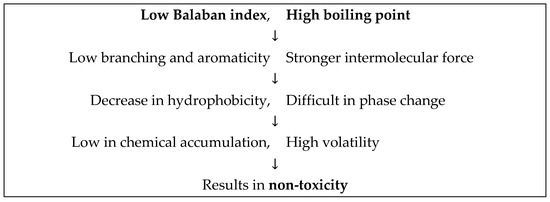 Rule 4 expressed in the “IF-THEN” statement, “If the molecular structure of organic solvent has the Balaban index in the range of 34 to 63, boiling point greater than or equal to 104 °C, then the inhalation LC50 falls within the range of 10 to 100 ppm, the organic solvent is classified as extremely to highly toxic in human health.” The coverage of rule 4 was 32.26% by fulfilling 10 out of the 31 organic solvents of training data under class 1 toxicity. The certainty in the value of 100% indicated 10 organic solvents were classified in the correct decision attribute.