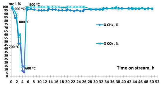 It was found [39] that this material, after prereduction in CH4 and CO2 mixture or in hydrogen flow, formed a catalyst which demonstrated low efficiency in DRM. It showed syngas yields of 88–90% at 900 °C only after a long-term exposure in the CH4/CO2 flow.