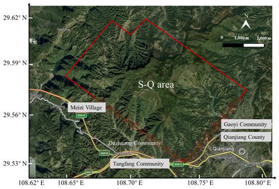 The study area (S-Q) is located in the southeast of Chongqing in China (Figure 1). The area is a typical karst landscape with large topographic undulations and a steep formation dip angle, as shown in Figure 2. The topographic map in the S-Q area was derived using the Google Earth Engine (GEE). The highest elevation reaches 1900 m, the lowest elevation is 270 m. The structure belongs to the Qiyao Mountain convex fold belt and Qianjiang depression fold belt, located in the southeast of the Chongqing–Xiangxi isolated channel type alluvial fold belt. The anticlinorium and syncline are in parallel with each other, and the direction of the fold axis roughly extends in a northeast to southwest direction; the formation dip angle is about 35 degrees to 75 degrees, with a steep dip and basic symmetry on both flanks. The internal faults in the anticlinorium and syncline are relatively developed, and the dip angle in the core faults is steep (about 57 degrees to 75 degrees) with the characteristics of a high stratigraphic uplift, strong tectonic compression, and high and steep structural development.