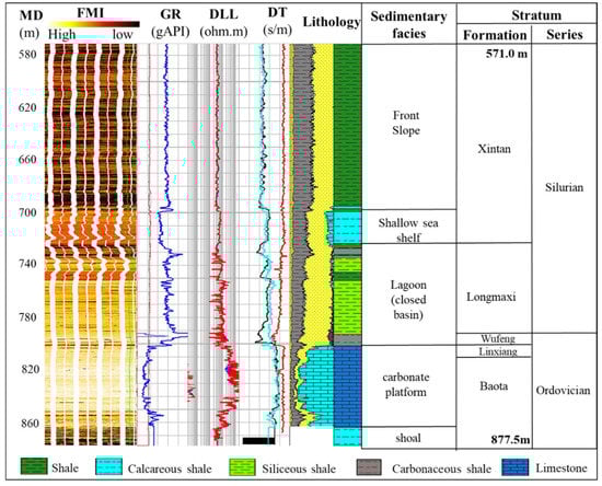 Integrating the data collected from test cores, well drilling and logging in the area, the sedimentary phases are carbonate shoals, terraces, occluded basins (lagoons), shallow marine shelves and foreshore slopes from the bottom to the top of the stratum, as shown in Figure 3. The phase shows the water body-changed process from the Ordovician to the Silurian. The water body took place by turning from shallow to deep. The typical characteristics of the sedimentary phases of each stratum are briefly described as follows: