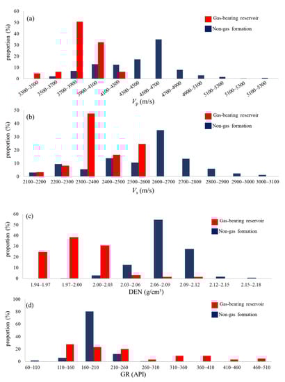 The petrophysical characteristics of the shale gas reservoir in the S-Q area, as the constrained condition for SPCNSI, were counted with logging data. This process is conducive to making the inversion results of seismic records closer to the true situation of the strata. The statistical results for the Longmaxi and Wufeng formations of the S-Q-2 well are shown in Figure 4, which include gas-bearing and non-gas reservoirs. The statistical parameters are Vp (longitudinal wave velocity), Vs (transverse wave velocity), DEN (rock density) and GR (natural gamma) at a vertical depth of 727–801.8 m.