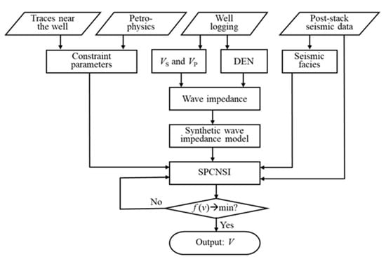 The implementation of nonlinear stochastic inversion can be divided into two parts: stochastic simulation and nonlinear inversion. The transformation characteristics of reservoir parameters in space are represented with three features: the range, still, and the nugget constant. Synthetic seismic records are synthetized through Gaussian simulation and morphological modeling under the constraint of the sedimentary facies. SPCNSI is performed on each seismic channel, and this process is shown in Figure 5. The acoustic velocity and the rock density from logging data were used to establish an initial wave impedance model for the formation. The constraints for SPCNSI were from the relationship between the distribution of sedimentary facies in the target layer and post-stack seismic records. Within the time window range of different sedimentary facies, the initial wave impedance model obtained from logging data was extrapolated along the phase change direction. It was the control condition of the inversion of the next seismic record. After multiple iterations to minimize the perturbation term between the synthetic and actual seismic records, the acoustic velocity in the formation could be obtained [34].