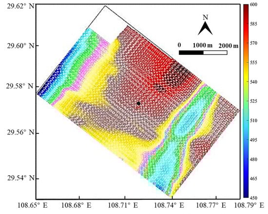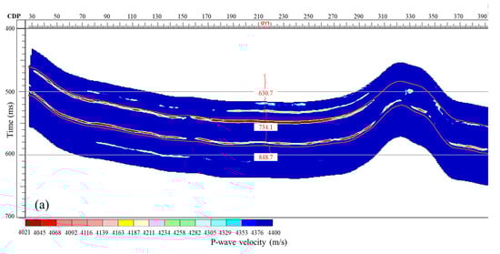 In terms of the stratigraphic velocity profile, the boundaries of the shale gas reservoir less than 35 m can clearly be identified, and the reservoirs can be traced throughout the area (Figure 8); this reflects the spatial distribution characteristics of reservoirs in both the horizontal and vertical directions. The distribution range of shale reservoirs is wide, with the obvious low P-wave velocities (approximately 3500–4700 m/s). Combined with geological parameters such as the gas content, reservoir thickness and rock porosity in this area, the original oil in place of the shale gas in this area reached 210 × 108 m3.