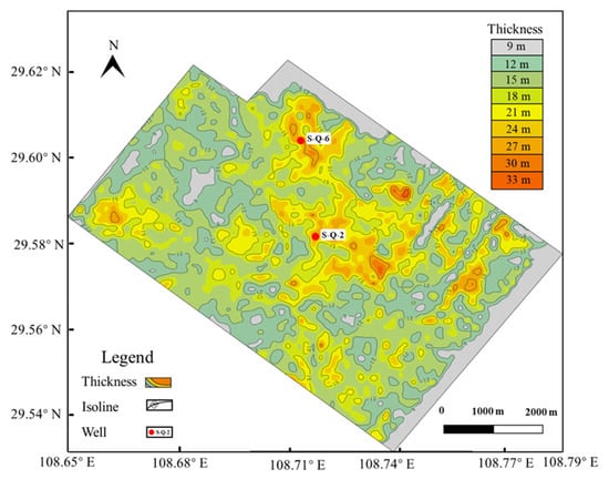 The shale gas reservoir of the Longmaxi Formation is distributed stably in the whole area, with less thickness variation, as shown in Figure 9. The maximum thickness is about 18 m, and the minimum thickness is about 7 m. Reservoirs with a thickness greater than 15 m are mainly developed in the S-Q-2 well area and in the north of the area. Thicknesses of less than 9 m only appear locally. The reservoir of the Wufeng Formation is characterized by a stable distribution and wide range, with a maximum thickness of 12 m and an average thickness of about 7 m. Reservoirs with a thickness greater than 10 m are concentrated in the north of the study area, while thicknesses less than 4 m are mainly distributed near the faults. The inversion results are consistent with the logging interpretation of the shale gas reservoir on wells Q1 and Q2.
