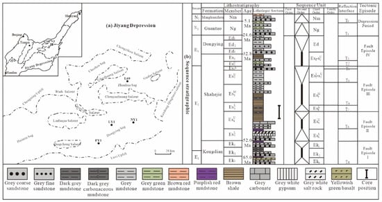 Jiyang Depression belongs to the first-order structural unit of Bohai Bay Basin. It is located in the west of the Tanlu fault belt, the south of Chengning uplift, and the north of west Luxi uplift. Its east–west length is 240 km. The widest part is about 130 km, and the distribution area is 26,000 km2. The Jiyang Depression contains four negative secondary structural units in Dongying Depression, Huimin Depression, Zhanhua Depression, and Chezhen Depression, as well as a series of positive secondary structural units such as Gudao Uplift, Yihezhuang Uplift, Chenjiazhuang Uplift, Wudi Uplift, Binxian Uplift, and Kendong Qingtuozi Uplift, with typical uplift-concave structure (Figure 1a).