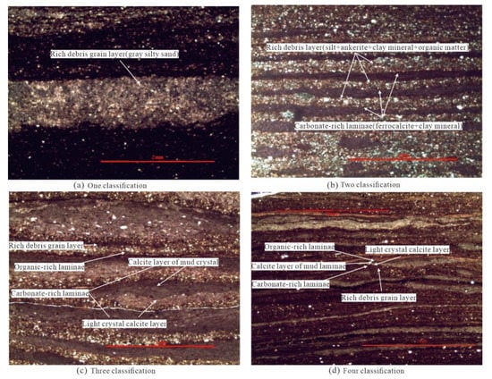 In this paper, the formation of quartic laminae is analyzed. The terrestrial clasts, organic matter, and carbonate minerals in the laminae are of mechanical, biological, and (biological) chemical origin, respectively. Based on the features of “cold and dry winter and spring, hot and rainy summer and autumn, stratified lake water in winter and summer” in temperate zone or middle and south subtropical monsoon climate, the development model of four types laminated layer combination of shale was established. In spring, due to the increase in temperature and precipitation, the lake level rises, vertical exchange and mixing take place in the stratified water body, and the freshwater, debris, and inorganic salt supplied by the material source are conducive to the growth of algae such as diatom and ditch whipped algae [42], especially in the late spring and early summer, the algae flourish, die, and deposit, forming rich organic laminae. In summer, the climate temperature is high. The precipitation is sufficient and the organisms are flourishing. The carbonate-rich laminae are formed by the (biological) chemical and biological sedimentation. At the same time, the organic matter is difficult to precipitate and decomposes in a large amount due to the stratification of the water body, so the organic matter is relatively undeveloped. In autumn, the temperature began to decrease, the precipitation decreased, the salinity increased, and the stratified water began to mix again, which was beneficial to the growth of algae such as pelagic algae and the increase in organic matter and clay minerals. Because of the frequent change in sedimentary environment, the four-type laminated assemblage of page-like structure does not necessarily develop completely. The type of laminated assemblage, laminated monolayer thickness, and continuity of the laminated structure vary with the type of sedimentary environment, duration, and mixing degree of different parts, so as to evolve into laminated, thin, and laminated and massive.