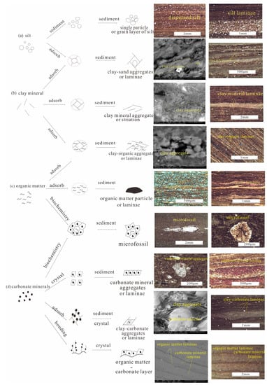 Organic matter is common in shale, but its genesis is varied. Living microorganisms can form algae mat after growth, bloom, and death, and retain them to train laminae. Larger organisms, such as fish, bivalves, and gastropods, can settle directly after death. Organic matter is mainly dissolved and granular in water. Because of fine particles and irregular morphology, the adsorption of organic matter on clay minerals or silty sand causes the coagulation or adsorption of organic matter on the surface of sediment. Because the growth of planktonic microorganisms and the sedimentation of clay minerals tend to be weak in hydrodynamic environment, organic matter and clay minerals have similar surface physicochemical properties, and they are usually complexed together by deposit [43]. Therefore, the sedimentation of organic matter is the product of a combination of biological or biochemical, chemical, and mechanical sedimentation (Figure 3c).