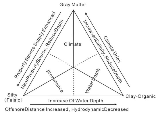 Silty-grey (cloudy), silty-clayey, organic matter and clay, and organic matter-grey (cloudy) are composed of silty sand, clay minerals, and lime (cloudy) minerals. The silty-grey (cloud) sequence mainly represents the mixing degree of mechanical sedimentation and (biological) chemical sedimentation, reflecting the strength of the source supply: The higher the silty sand content, the closer the sedimentation area to the source area, the higher the proportion of mechanical sedimentation. The silty-clay-organic matter sequence mainly represents the degree of mechanical differentiation or the degree of mixing of mechanical sedimentation with colloidal sedimentation and biological sedimentation, which reflects the strength of hydrodynamics and can indicate the change in water depth or offshore distance: The higher the content of clay minerals and organic matter, the more thorough the mechanical differentiation and the deeper the water body. Clay, organic matter-ash (cloud) sequence, mainly represents the mixing degree of colloidal sedimentation or biological sedimentation and (biological) chemical sedimentation, reflects the salinity of the water body, and can indicate climate change and water depth change: The higher the content of ash (cloud), the higher the proportion of (biological) chemical sedimentation, the shallower the water body, the greater the salinity, and the more arid the climate (Figure 4).