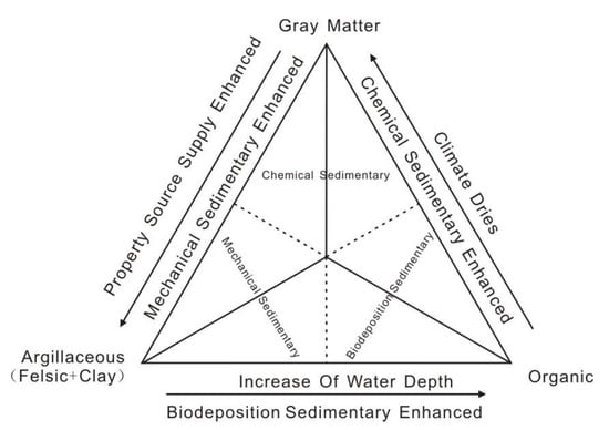 Most of the clay minerals in shale are brought in by rivers, and a few are self-sedimentation or autogenesis. Clay minerals are developed in all regions of the lake basin, but tend to be deposited in the water environment. Climate conditions can also affect clay mineral content; wet climate helps chemical weathering, provides more clay minerals and other fine debris, and lake water depth is conducive to clay deposition. In addition, there is more fresh water supply under humid climate conditions causing lake water desalination, while under arid climate conditions, the lake shrinks, causing lake water salinization. Because the growth environment of plankton in the basin, the preservation environment after death and the climatic conditions are close to the sedimentary environment of clay minerals, the clay minerals and organic matter in the lacustrine shale closely coexist, and they are usually considered as clay-organic matter units. Therefore, the clay mineral-organic unit in shale can reflect the hydrodynamic strength, climate type, and salinity, and the water depth is a good indicator of the hydrodynamic strength, while the water depth change can reflect the salinity change (Figure 4).