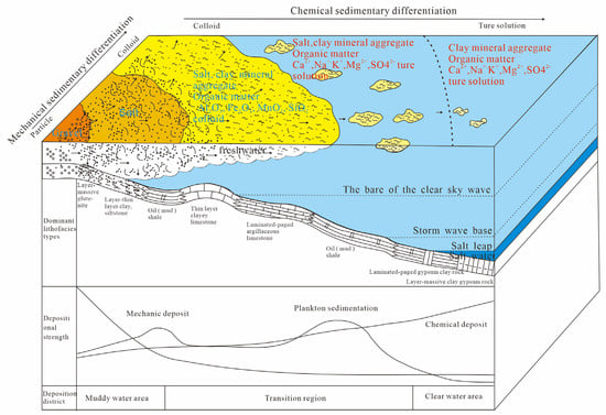 Rocks are not only the aggregates of minerals, but also the products of sedimentary environments. Modern sedimentation shows that when rivers flow into large lakes or oceans, not only mechanical debris and colloids, but also large amounts of freshwater and ions are injected, forming three different depositional zones on the plane: muddy water zone, transition zone, and clear water zone. Muddy water area refers to the range of water body affected by terrestrial debris in the edge of the lake basin for a long time. The salinity of water body is desalinated as freshwater–brackish water due to river water injection. The water body in this area is shallow, mostly above the wave base, with strong hydrodynamic force, and the sedimentary environment is a weak oxidation reduction environment. The clean water area refers to the range of the water body in the center of the lake basin, which is basically not affected by terrestrial debris. The water body has large salinity and is a brackish–saltwater environment. Meanwhile, the water body in the area is deeper, mostly below the storm wave base, with weak hydrodynamic force and clear water body. Due to the deep and quiet water body, the water body is often characterized by strong stratification and strong reducing environment. The sediments are primarily chemical and biological deposits [44]. Transition zone refers to the scope of the water body transitional between the muddy water area and the clean water area on the slope of the lake basin. The impact of the material source in this area is smaller than that in the muddy water area, and the water body is turbulent. As it is located in the platform, the water body develops upward of the current, and the water body environment is mainly composed of brackish water, medium stratification and reducing environment, and mechanical sedimentation, chemical sedimentation, and biological sedimentation coexist or alternate.