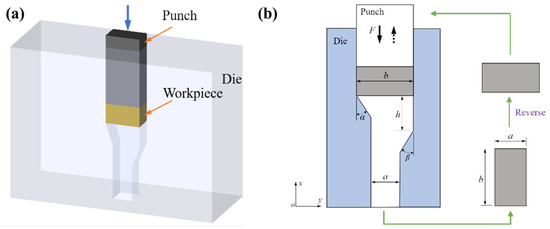 The geometry of the die channel is symmetrical in most extrusion cases. Accordingly, the deformed zones are formed symmetrically in the workpiece and the desired reduction in the workpiece cross-section can be achieved. However, the variation in the workpiece cross-section makes it very difficult to re-extrude the workpiece with the same die, which is basically required in SPD of bulk workpieces. Some changes were made in AGE to solve this problem. First, the cross-section of the die channel and the initial billet are both designed with a rectangular profile, as shown in Figure 1a. As a result, the deformation of the workpiece in the channel can be approximated as a case of plane strain. An illustration of the AGE process is shown schematically in Figure 1b. The thickness of the initial billet is constrained to be equal to the width of the channel outlet to ensure that the shape of the workpiece remains unchanged after extrusion. As shown in Figure 1b, the extruded part has the same shape and dimensions as its initial counterpart. In this way, repeated extrusion of the part can be achieved and a targeted strain in the part can be achieved with multiple extrusion passes.