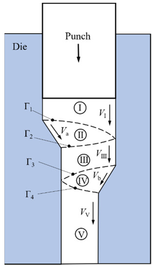 According to the characteristics of metal flow in the die channel, the workpiece can be divided into five parts, which are schematically illustrated in Figure 2. In region I, the material, which is assumed to be rigid, moves downward with a constant velocity VI, which is equal to the punch velocity. The material undergoes plastic deformation in region II and region IV. Depending on the value assigned to parameter h, the two deformation regions II and IV can interact in region III or be totally independent. However, to realize our goal, the parameter h should be large enough to separate the two plastic deformation regions. Therefore, the material in region III has a rigid flow. In region V, the material moves to the exit of the die with constant velocity VV without any further deformation. The volume of the material does not change before and after extrusion, so the speed relationship of the material in region V and region I can be expressed as VV = (b/a)VI. Region II is the first deformation zone, which is separated from region I and region III by the entry and existing surfaces Γ1 and Γ2. They belong to the slip line field of the first deformation zone (DZ-1) and correspond to the beginning and end of deformation. Similarly, Γ3 and Γ4 are the entry and existing surfaces of the second deformation zone (DZ-2), which belong to the slip line field of DZ-2.