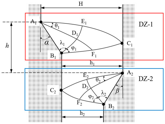 As shown in Figure 3, the vertical distribution of these two SLFs reveals that the parameter h largely defines the behavior between these two DZs. In order to form two independent DZs, a large value should be used for h. Due to the SLFs of these two DZs having very similar characteristics, only the SLF of DZ-1 is discussed in detail below. The geometry of the DZ-1 slip line configuration is defined by the field angles λ1, φ1, and θ1 and the die angle α. The value of λ1 is dependent on the friction condition at the interface between the die and the work material. For a frictionless condition, the value of λ1 equals π/4. The parameter φ1 reflects the range of reductions for which the field is valid. When the extrusion ratio tends to its maximum value (for which θ1 = 0), the SLF tends to its limit. When θ1→0, the point E1→D1 and the point C1→F1 so that the slip line field A1E1C1F1B1 can be approximated with a triangular one A1B1C1. The kinematically admissible velocity field associated with the SLF from DZ-1 becomes a triangular velocity field, as shown in Figure 4a. In this field, the material moves parallel to the inclined wall with velocity Va. At each point on the surfaces Γ1 and Γ2, the velocities VI and Va suddenly change the direction.