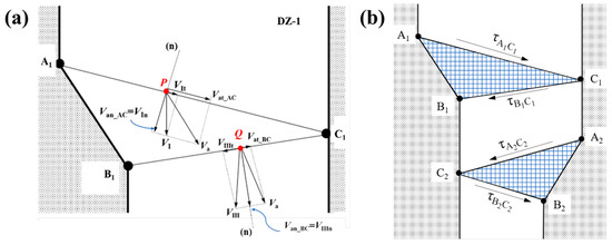 For an arbitrary point P on AC, its corresponding point on BC is Q. As shown in Figure 2, the velocity at point P is affected by both the region I velocity VI and the region II velocity Va. The velocity decomposition of VI and Va along the AC tangential and normal directions is shown in Figure 4a. Due to the continuity of metal flow, VI and Va on the AC normal direction must be equal; that is, Van_AC = VIn. However, as illustrated in Figure 4a, the velocities of VI and Va on the AC tangential direction have different values, Vat_AC > VIt. The differences between Vat_AC and VIt define the velocity discontinuities, giving rise to tangential stress τAC. Similarly, the velocity decomposition of the region II velocity Va and region III velocity VIII in the BC normal and tangential directions at point Q on BC is also displayed in Figure 4a. In addition, the velocity Vat_BC and VIIIt in the BC tangential direction are also different. Therefore, a stress τBC along the BC tangential direction is formed at point Q.
