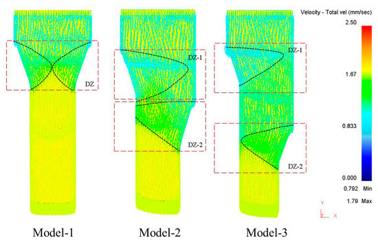 The velocity field results for the workpieces in the three simulation models are shown in Figure 5. Compared with model one, which was a traditional direct extrusion method, more deformation-zone areas were formed in the AGE method, as is clearly shown in models two and three. The larger h was, the more deformation-zone areas were generated. This indicates that the extreme deformation in direct extrusion can be largely smoothed in AGE. In addition, along the punch-moving direction, one deformation zone in direct extrusion was transformed into two deformation zones. Moreover, when a higher value was assigned to h, such as in model three, two independent deformation zones could be generated in the die channel. This provides an amazing strategy to obtain a more even strain field in a bulk workpiece through compensation by the two independent deformation zones.