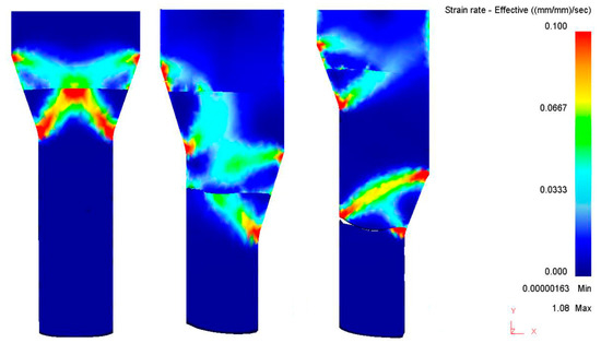 The slip line field in the workpiece can be reflected by the equivalent strain rate, which is schematically illustrated in Figure 6. According to the results, high strain rates were generated at the entrance and exit of each deformation zone. In addition, two independent strain rate zones were formed in model three, which was the result of the velocity field, as shown in Figure 5. The simulation results for the strain rate were very similar to the slip line field discussed in Section 2, which supports the theoretical analysis results. Correspondingly, coarse grains can be more effectively refined to a smaller size in AGE, especially under the condition where two independent deformation zones are formed, as shown in model three.