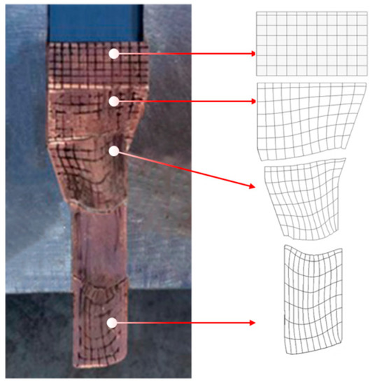 In order to investigate the deformation characteristics of the samples in the die channel, rectangular grids were sprayed on the surfaces of all samples. The deformed shape of the samples in the die channel is shown in Figure 8. It was clearly verified that two deformation zones can be formed in AGE. In addition, the variation in the rectangular grids on the sample surface was very consistent with the results for the mesh shape from the simulation. The theoretical and simulation results discussed in the above sections were verified.