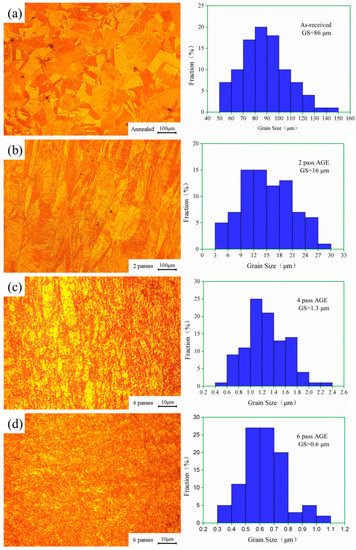 The microstructure variation in the multi-pass AGE was examined using optical microscopy, the results of which are shown in Figure 9. In addition, the grain size statistics results, which were extracted using the open-source image processing software ImageJ 1.53v, are also shown. It was obvious that the grain size was dramatically refined with the increase in the number of passes with AGE. The original grain size of annealed samples was 86 μm on average. Meanwhile, the shape of the grain cross-section was dominated by isometric polygons. After two passes of AGE, the average grain size was reduced to 16 μm, and fibrous grains were mainly produced. By increasing the number of extrusion passes, an average grain size of 1.3 μm and 0.6 μm could be achieved with four and six passes, respectively. In addition, the grain size distribution was simultaneously concentrated, which means more uniform grains can be obtained. The grain size variation results indicated that AGE is a promising SPD method for the preparation of UFG materials. In conclusion, the AGE method not only produces small grains but also a uniform grain size distribution.