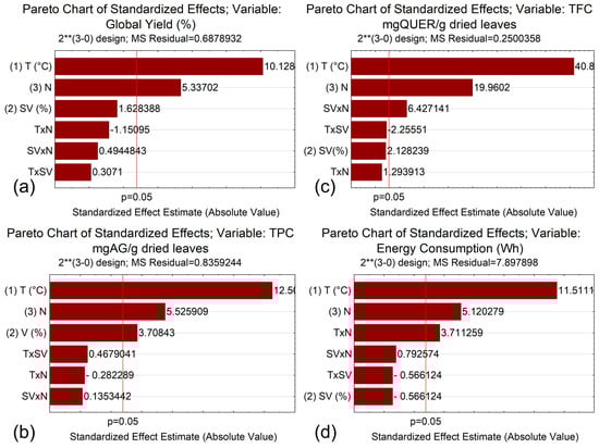 According to the extraction results for Passiflora leaves using pressurized ethanol 70% (Table 4), the global yields (X0) ranged from 22.3 to 33.1%, where the highest values were obtained under the conditions of tests 12 (33.1%) and 9 (32.5%) (Table 4). In the statistical analysis of the main effects (excluding the axial points, Table 1), only the temperature (T) and the number of cycles (N) promoted significant effects on X0; no effects of interactions were observed, as can be noted in the Pareto diagram shown in Figure 1a.