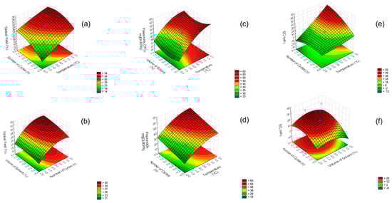 From the quadratic and linear models, it was possible to generate response surfaces (quadratic models) or contour surfaces (linear models) and analyze the influence of process variables on all responses.