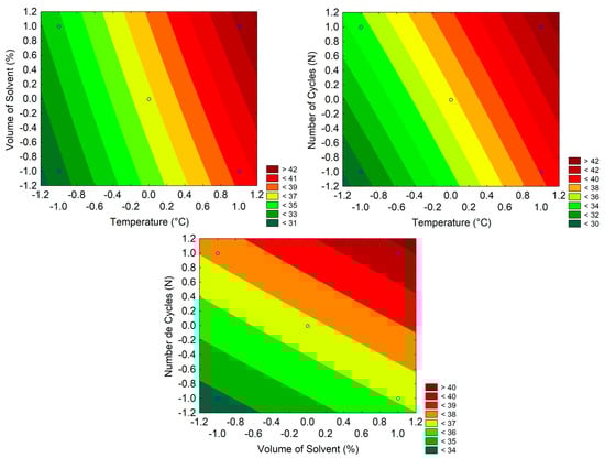 In Figure 1a,b, the response surface for the global yield shows the highest X0 obtained at the highest temperatures and the largest number of cycles. The highest solids extraction yields occurred at 113 °C, a 100% extractor volume as the rinse volume (SV) and three cycles. The behavior of the global extraction yield (X0) increased due to the increment in temperature (T). In the study by Mustafa and Turner [59], the authors concluded that extremely high temperatures in PLE contributed to higher yields and faster extraction times since high temperatures facilitate the breakage of intermolecular interactions between the sample and the solute. Consequently, there is a reduction in surface tension between the three components (solute/sample/solvent) and a decrease in viscosity, which favors the penetration of the solvent into the leaf pores [60].