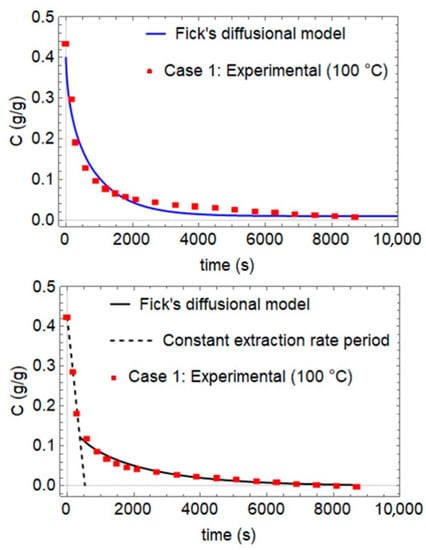 After the CER period, a Frick’s model was adjusted with similar conditions to the preceding case, but with some differences: In Equation (6), instead of using , (g/g) was considered, which is the concentration of the dry extract in the solid domain at the beginning of diffusion mass transfer for . The extraction kinetics profiles were plotted based on the solute concentration over the extraction time and Fick’s analytical solution for cylindrical coordinates. Thus, the effective mass diffusivity for each temperature was established.