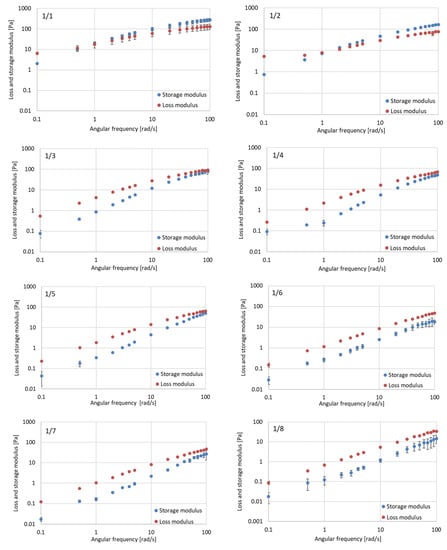 Frequency sweep measurements were carried out for angular frequencies in the range of 0.1–100 rad/s, with the shear deformation selected for the sample from the viscoelastic linearity range determined during the amplitude sweep.