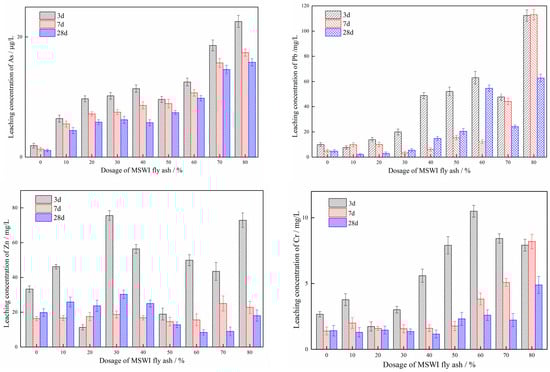 - The optimal mass ratios of BFS:SS:DA:PAS for MSWCM preparation were 36:32:12:20 (w.t.%). The compressive strength of MSWCM with 80% MSWI fly ash content was 2.9 MPa during the 28-day curing period, which met the standard requirements. The leachability of As, Pb, Cr and Zn were far below Toxicity Characteristic Leaching Procedure (TCLP) standard requirement and the threshold value specified in Standard GB16889-2008.