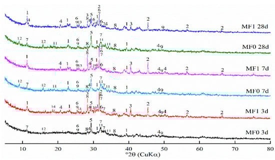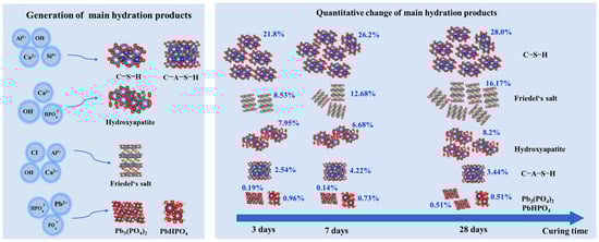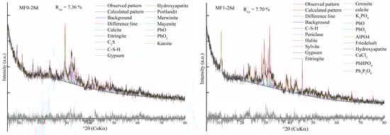 - The refinements of the samples MF0 and MF1 got low Rwp and Rexp values, which indicated that the refinement results were acceptable and reasonable. Most of the hydration reactions had started at the initial stage of curing and reacted quickly to form a large amount of hydration products. For the pure MSWCM paste, the main hydration products were C-S-H, hydroxyapatite and ettringite. With increased curing time, the content of ettringite increased obviously. For the MSWCM paste with MSWI fly ash, the content of C-S-H and Friedel’s salt increased significantly with increased curing time. During a curing period of 3 days to 28 days, the content of C-S-H and Friedel’s salt increased by 22% and 90%, respectively. Phosphate ions reacted with Pb to form a small amount of PbHPO4 and Pb3(PO4)2. It was further confirmed that phosphate had a good curing effect on lead ions. The hydration process could be deduced and evidenced by the changes in the content of the hydration products.