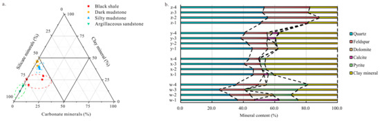 Figure 3b, black shale tended to have a higher pyrite content, averaging 20.9%, representing the main difference from other lithologies. The dark mudstone had a higher clay mineral content, averaging 44.7%, which was different from other lithologies. The mineral composition of silty mudstone is similar to that of dark mudstone, making it difficult to distinguish. The only difference is that the dark mudstone contains a small amount of pyrite, while the silty mudstone contains almost no pyrite. The content of quartz and feldspar in the argillaceous sandstone was higher, which was different from the other lithology.