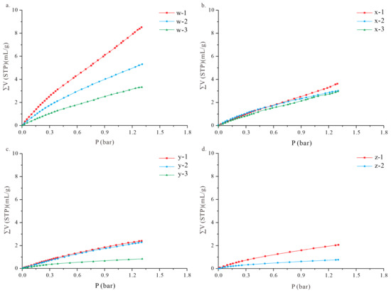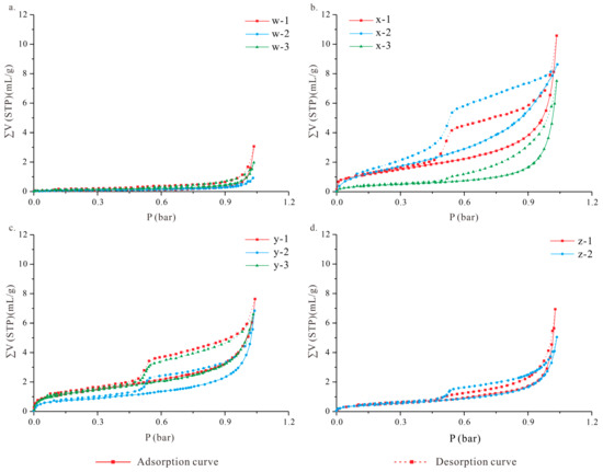 First, approximately 3 g of shale samples were weighed and crushed into 60–120 mesh sample tubes, and then they were degassed and dried at 110 °C in a vacuum of less than 10 mmHg for more than 10 h to remove moisture and volatile substances. Low pressure isotherm adsorption experiments were performed on a Quantachrome NOVA4200e specific surface area analyzer and porosimeter. This instrument is manufactured by Beiside Company in Beijing. Using high-purity CO2 gas as the adsorbate, the adsorption isotherm of CO2 at the mixing temperature of ice and water was obtained. During the experiment, the relative pressure (p/p0) was set in the range of 0.00001~0.03. N2 adsorption using high-purity N2 as the adsorbate was performed; the adsorption isotherm curve was obtained at the temperature of liquid nitrogen, and the relative pressure was set in the range of 0.005–0.995 during the experiment.