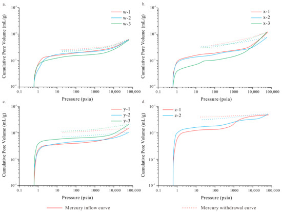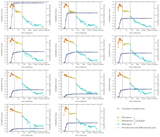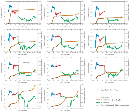 (a–c) Pore volume distribution curves of black shale; (d–f) Pore volume distribution curves of dark mudstone; (g–i) Pore volume distribution curves of silty mudstone; (j,k) Pore volume distribution curves of argillaceous sandstone.