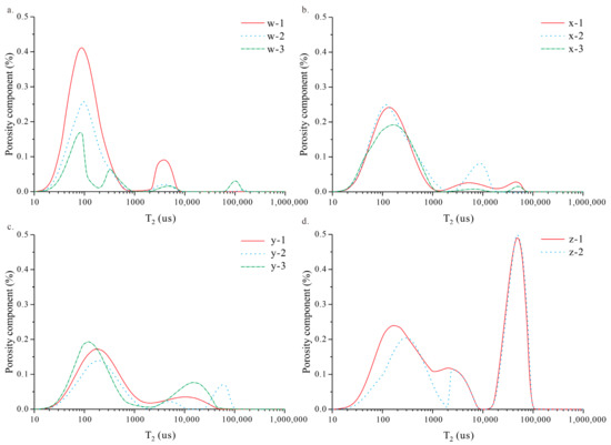 Plunger samples were used for the NMR experiments. The samples were placed in a closed saturated device and evacuated for 1 h to remove air and adsorbed impurities in the samples. Then, the samples were saturated with a 5% NaCl solution at a fluid pressure of 30 MPa for 24 h for NMR testing. In the fully saturated NMR test, the solution adhering to the surface of the sample needed to be wiped off with wet filter paper as these non-porous fluids can affect the accuracy of test results. The nuclear magnetic resonance experimental instrument was a MesoMR23/12-060H-I nuclear magnetic resonance instrument produced by the Suzhou Niu Mai Company (Suzhou, China). The magnetic field strength was 0.3 ± 0.03 T, and the main frequency (SF) was 12 MHz. NMR T2 analysis adopted a CPMG echo sequence. The experimental parameters were set as follows: echo interval time (TE), 0.1 ms; echo number (NECH), 16,000; waiting time (TW), 6000 ms; and scan number (NS), 32.