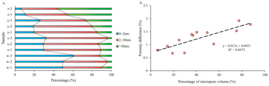 (a) The porosity ratio of different pore sizes using NMR; (b) the difference in porosity obtained with the two methods.