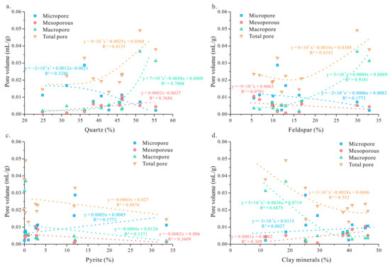 (a) Cross plot of quartz content and pore volume; (b) Cross plot of feldspar content and pore volume; (c) Cross plot of pyrite content and pore volume; (d) Cross plot of clay minerals content and pore volume.