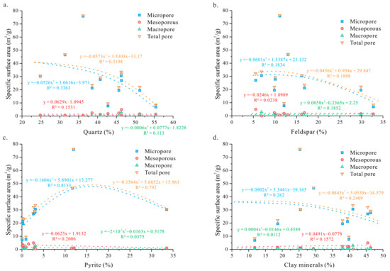 (a) Cross plot of quartz content and Specific Surface Area; (b) Cross plot of feldspar content and Specific Surface Area; (c) Cross plot of pyrite content and Specific Surface Area; (d) Cross plot of clay minerals content and Specific Surface Area.