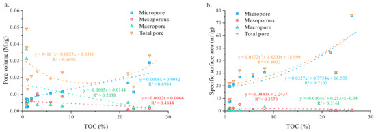 (a) Intersection diagram of pore volume and TOC; (b) Intersection diagram of TOC and specific surface area.